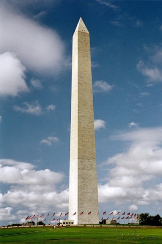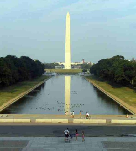 Feito de mármore, granito e arenito e desenhado por Robert Mills o Monumento a Washington, como o próprio nome diz, é um memorial ao “Pai da Pátria” George Washington, devido a sua participação decisiva no processo de independência dos Estados Unidos. Até 1889, quando da construção da Torre Eiffel, o obelisco era a maior estrutura já construída pelo homem. Sua conclusão é estimada em 21 de fevereiro de 1885, mas só foi aberto em 9 de outubro, três anos depois. Sua imagem é refletida no espelho d’água, à sua frente, dando a impressão de o monumento ser o dobro de seu tamanho.
